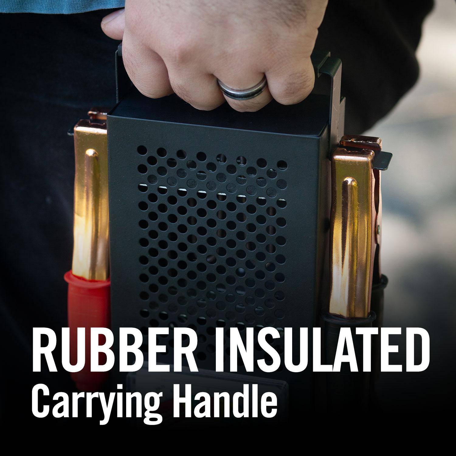 Rubber insulated carrying handle and color-coded heavy duty alligator clamps to ensure user safety