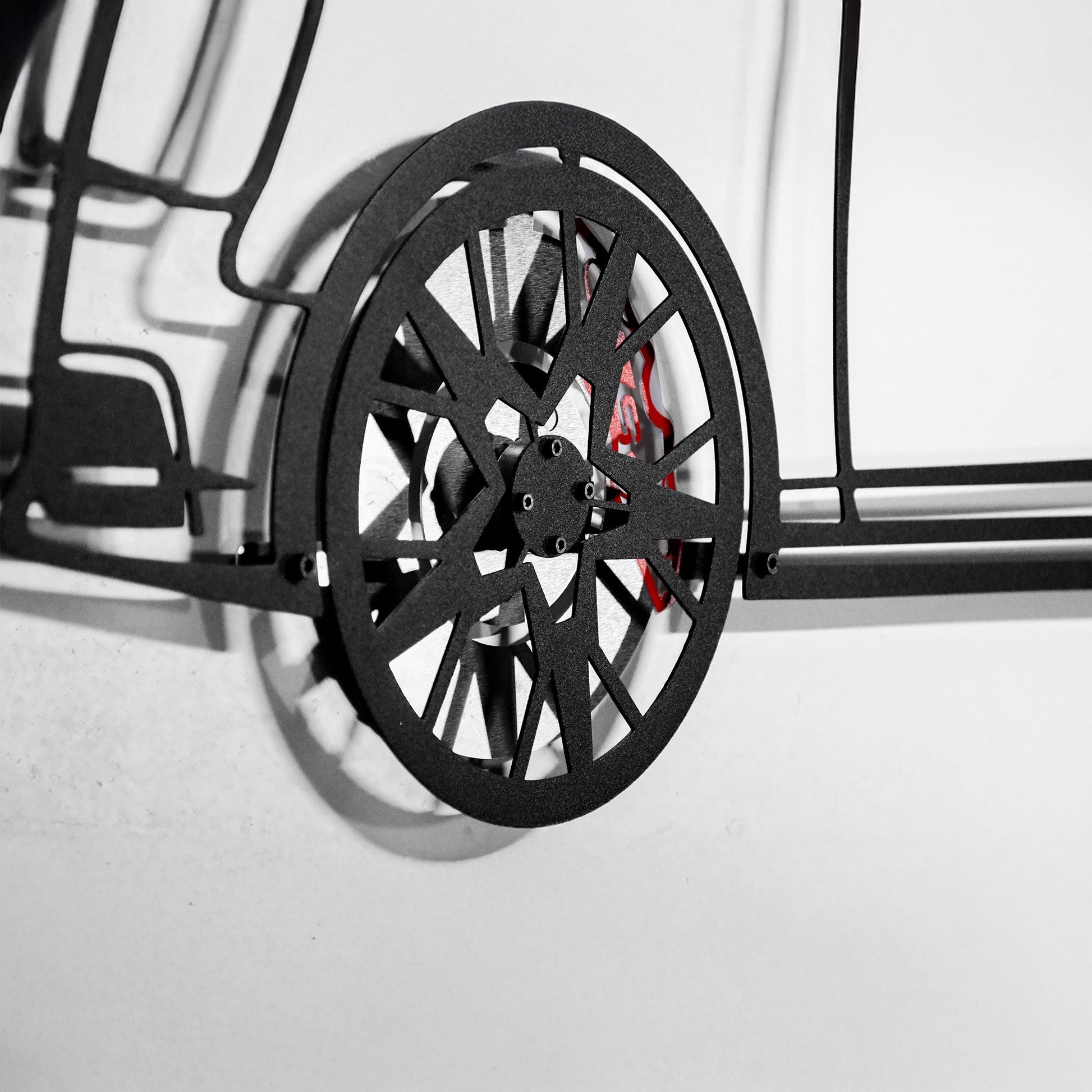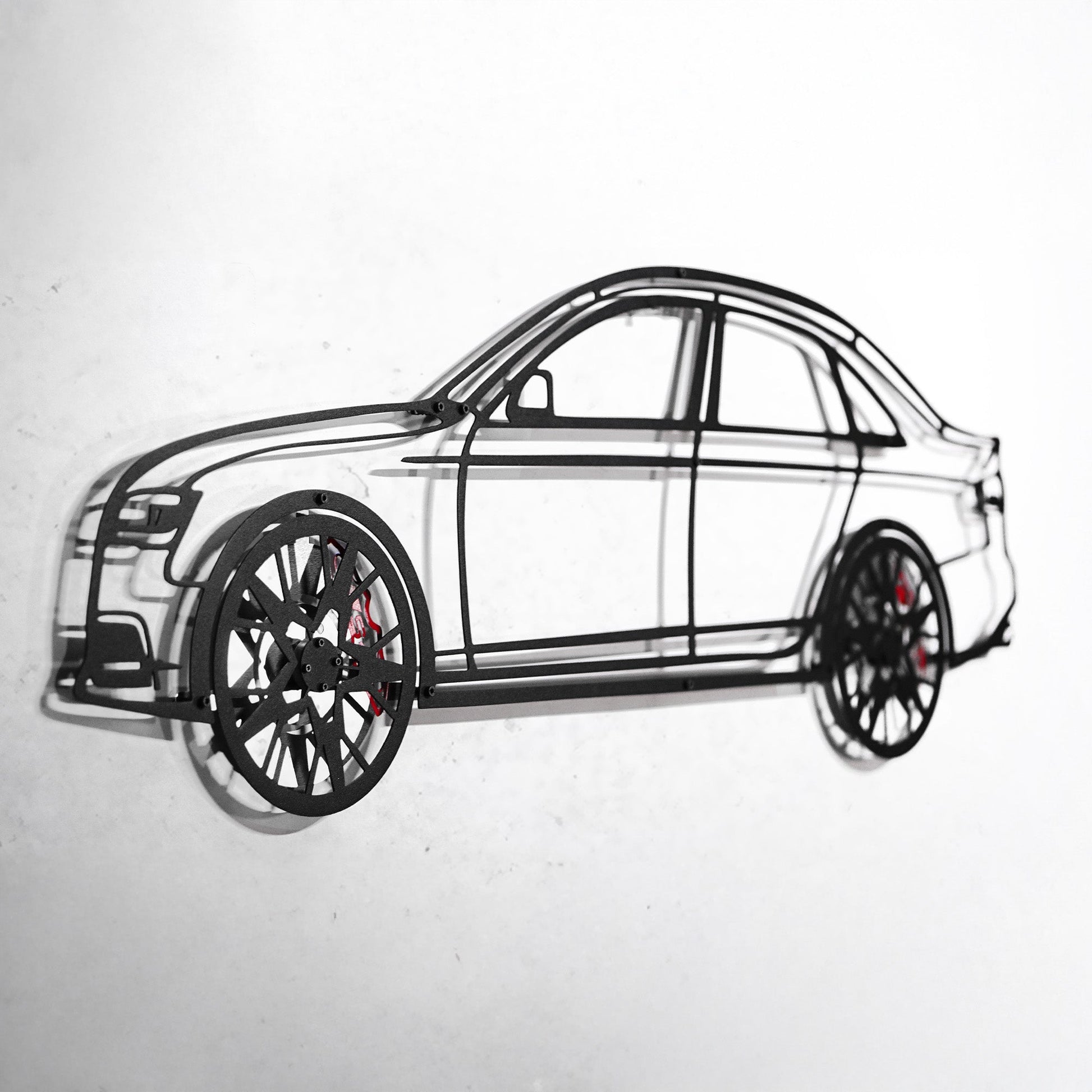 Laser-cut from 1.5 mm steel and coated with electrostatic powder paint, this piece highlights the sleek S4 profile. And yes — the wheels spin by hand. Because even on your wall, Audi deserves motion.