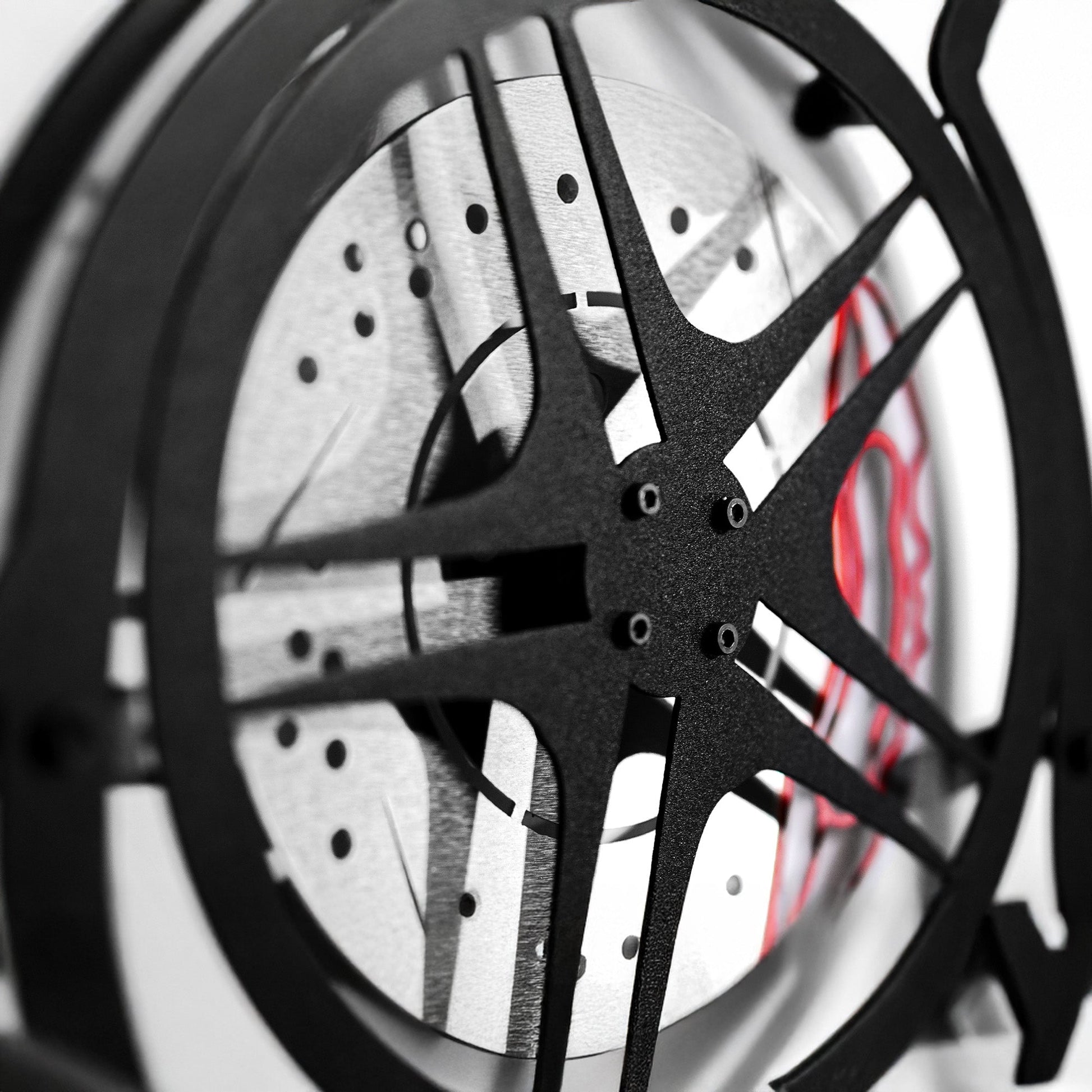 Laser-cut from 1.5 mm steel and finished in electrostatic powder paint, this piece captures the S2000’s iconic roadster profile. The wheels spin by hand, adding interactive fun to the art.